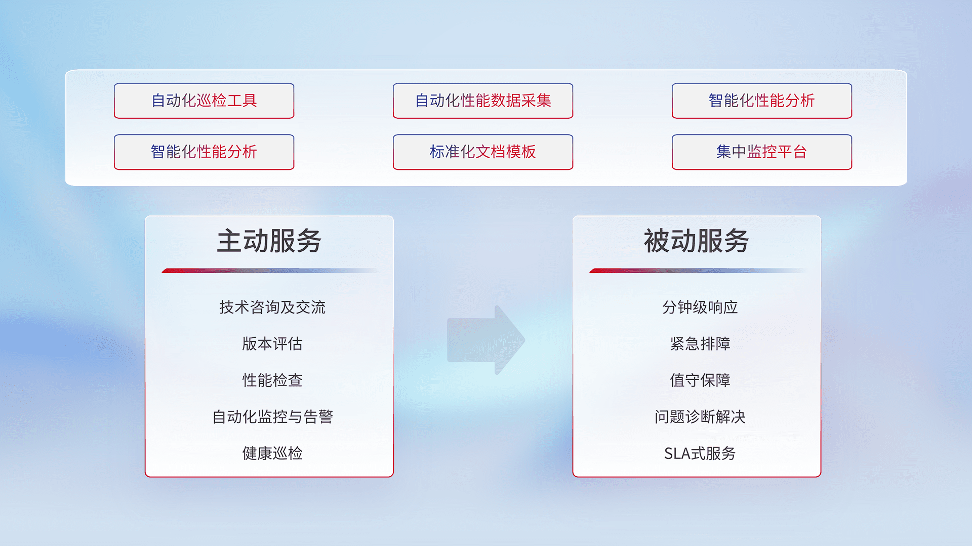 智能化工具和标准化文档,,,,保障服务质量,,提供主动服务(包含技术咨询、、版本评估、、性能检查、、、、自动化监控与告警、、健康巡检)和被动服务包含(分钟级响应、、、、紧急排障、、、、值守保障、、问题诊断解决、、、SLA服务)。。。。